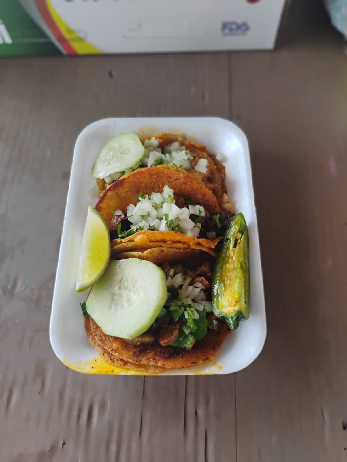 Carne de res sazonada y cocinada al estilo tradicional. Servidos en tortillas suaves, cebolla bien picada y cilantro y nuestra salsa especial.